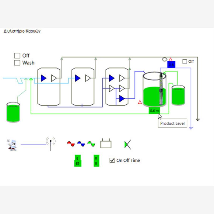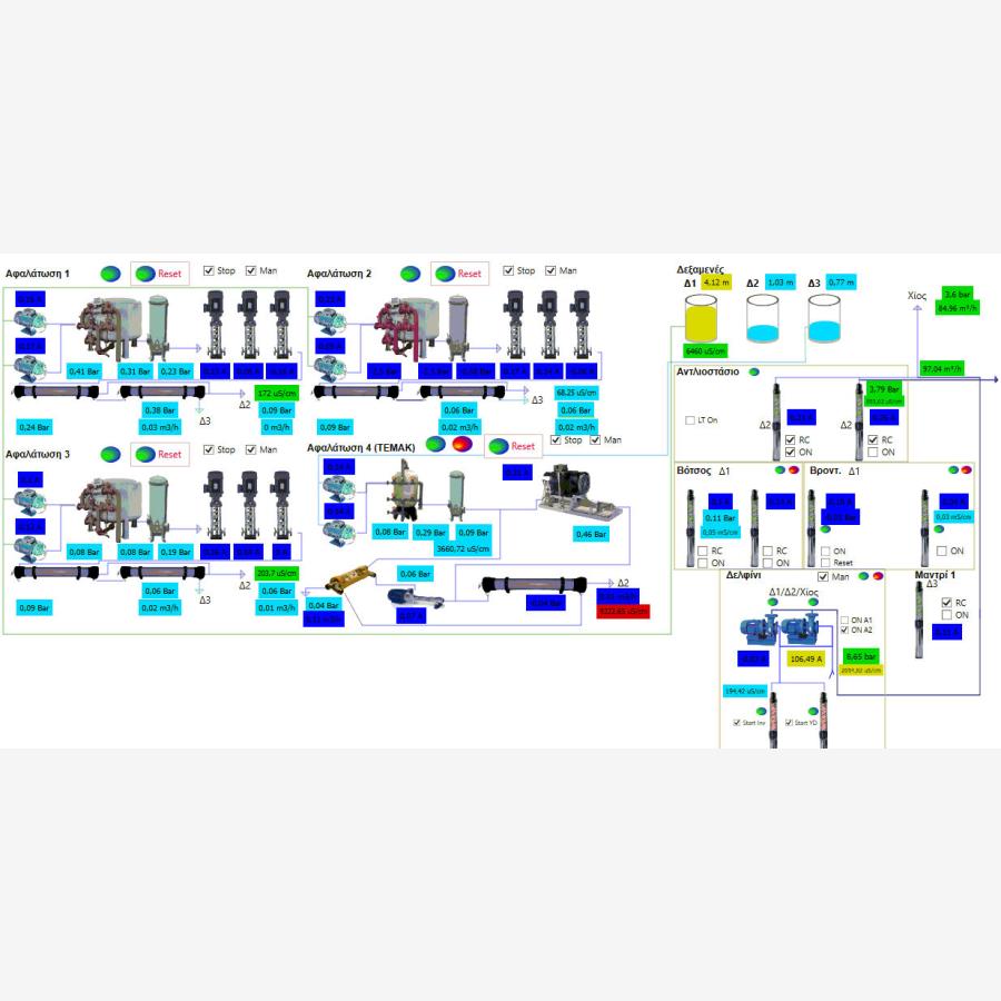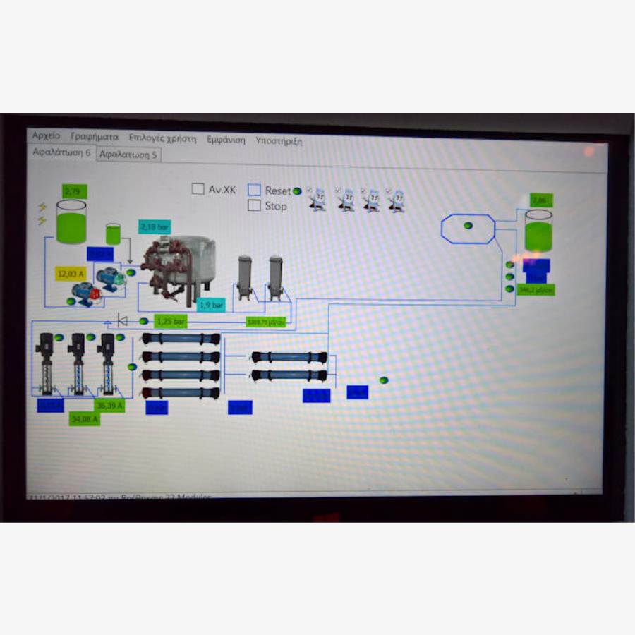 Σύστημα αυτοματισμού και SCADA για την λειτουργία οικιακής μονάδας επεξεργασίας νερού δικτύου ύδρευσης (τεχνολογίας αντίστροφης ώσμωσης) προκειμένου να καταστεί πόσιμο. Στο συγκεκριμένο σύστημα συνδυάζονται μετρήσεις από αισθητήρες με τιμές που παράγονται από το μοντέλο λειτουργίας της μονάδας, προκειμένου να υπάρξει συμβουλευτική στήριξη από το SCADA, για ευκολότερη ρύθμιση και μακροβιότητα των μεμβρανών αντίστροφης ώσμωσης και του υπόλοιπου εξοπλισμού.