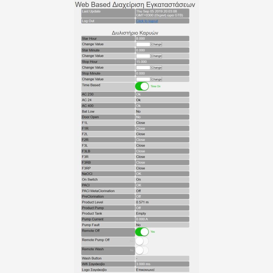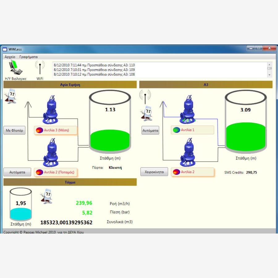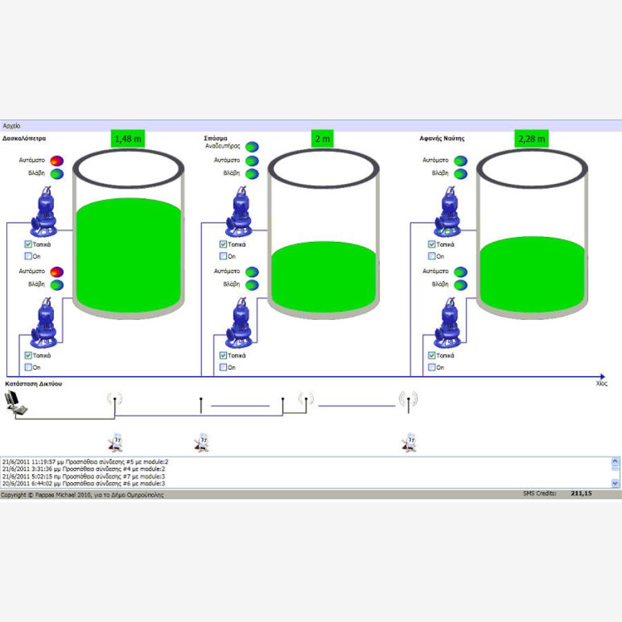 Εγκατάσταση συστήματος SCADA σε τρία κεντρικά αντλιοστάσια λυμάτων της δημοτικής κοινότητας Χίου. Επιπλέον παρακολούθηση πίεσης και παροχής σε κεντρικό αγωγό υδροδότησης.. Ειδοποιήσεις προσωπικού για βλάβες, παρακολούθηση μέσω διαδικτύου. Οι επικοινωνίες των απομακρυσμένων συστημάτων υλοποιήθηκαν με χρήση ασύρματου δικτύου WiFi και συνδέσεων aDSL
